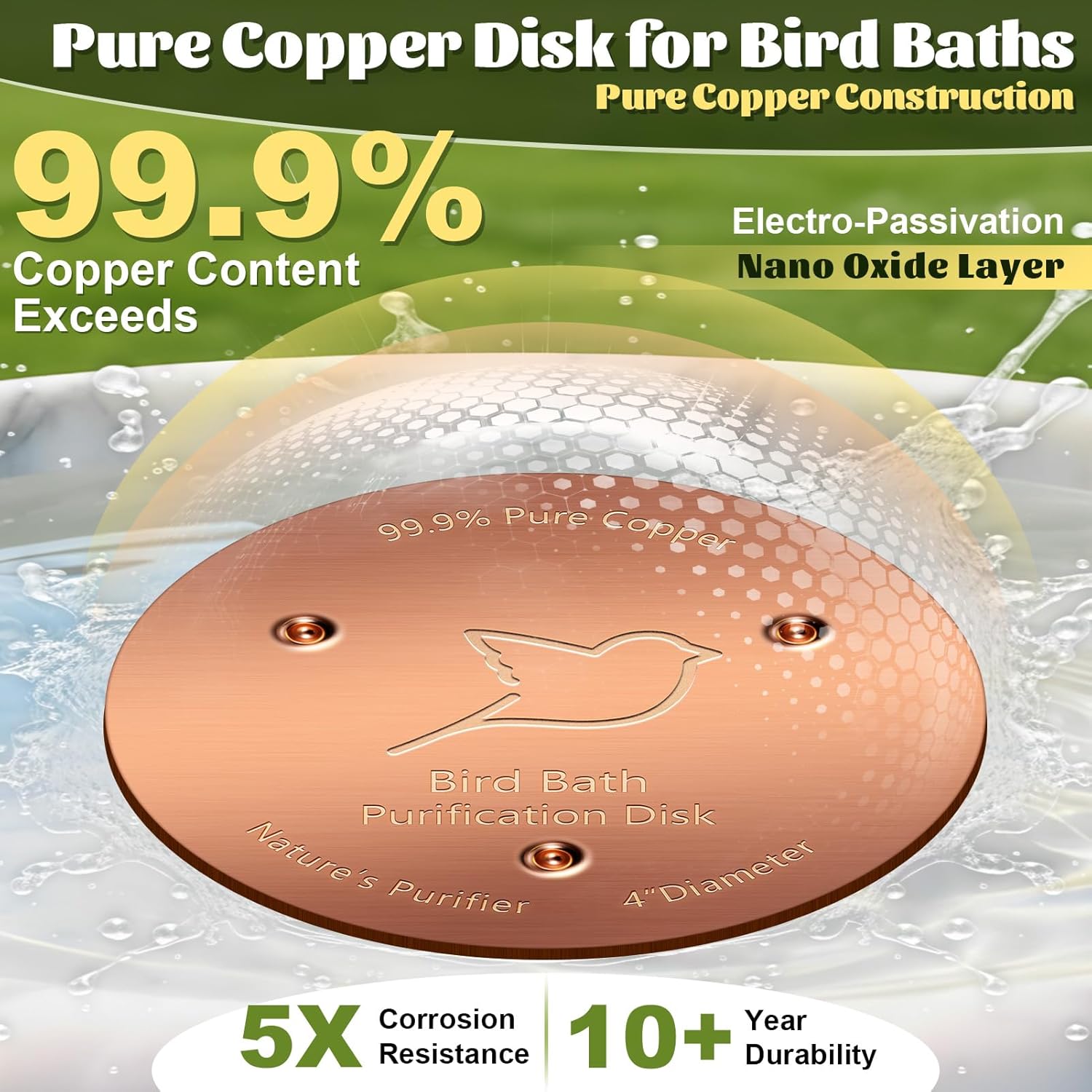- Optimal water purification: Designed to keep your birdbath water fresh and clean, the copper disk efficiently purifies water by naturally eliminating debris, such as droppings and leaves, reducing the need for frequent cleaning and ensuring your feathered friends have a safe drinking and bathing environment